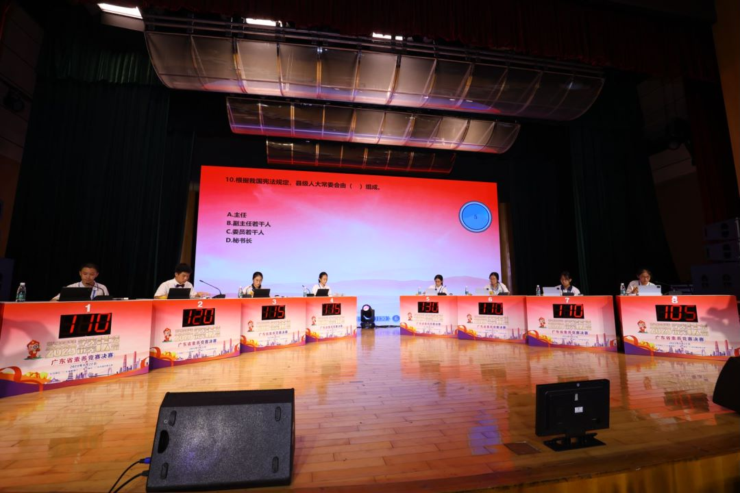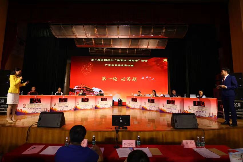 继9月19、20日第八届全国学生“学宪法 讲宪法”活动广东省演讲比赛决赛之后,9月22日,第八届全国学生“学宪法 讲宪法”活动广东省素养竞赛决赛在我校大学城校区顺利举办。省委教育工委委员、省教育厅党组成员、副厅长那佳,省教育厅政策法规处处长戴庆洲,我校党委常委、副校长刘海春,法学院党委书记杨敏生、校法治办公室主任王淑君、青少年法治教育中心主任潘高峰、法学院党委副书记范聪等出席活动。