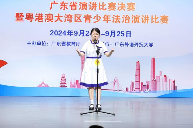 在9月24、25日第九届全国学生“学宪法 讲宪法”活动广东省演讲比赛决赛暨粤港澳大湾区青少年法治演讲比赛上,汕头市龙湖区金涛小学的余杭昕和广州市番禺区罗家桥虹小学的肖诺菲荣获小学组一等奖,广州外国语学校的柯浵琳、香港拔萃女書院的許詠詩和惠州市第一中学下埔校区的葛珈伊荣获初中组一等奖。广州市第五中学的宋一若和华南师范大学附属中学的高雅荣获高中组一等奖,华南师范大学的江博晨和中山大学的刘子愉荣获高校组一等奖。
