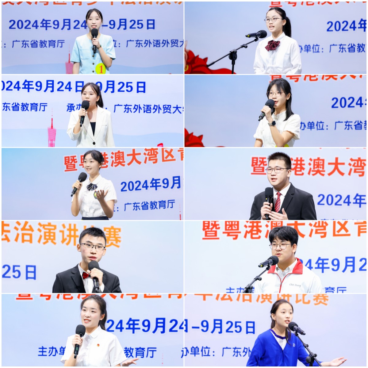 9月24日是第九届全国学生“学宪法 讲宪法”活动广东省演讲比赛决赛暨粤港澳大湾区青少年法治演讲比赛高中组和高校组的比赛,选手们以宪法为魂、以成长为线,用真挚而富有感染力的语言,讲述着粤港澳大湾区一个个鲜活的宪法故事,描绘出一幅幅生动的法治画面,展现出当代青少年对宪法和中国特色社会主义法治的坚定信仰与崇高追求。