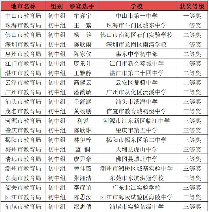 中学组获奖名单