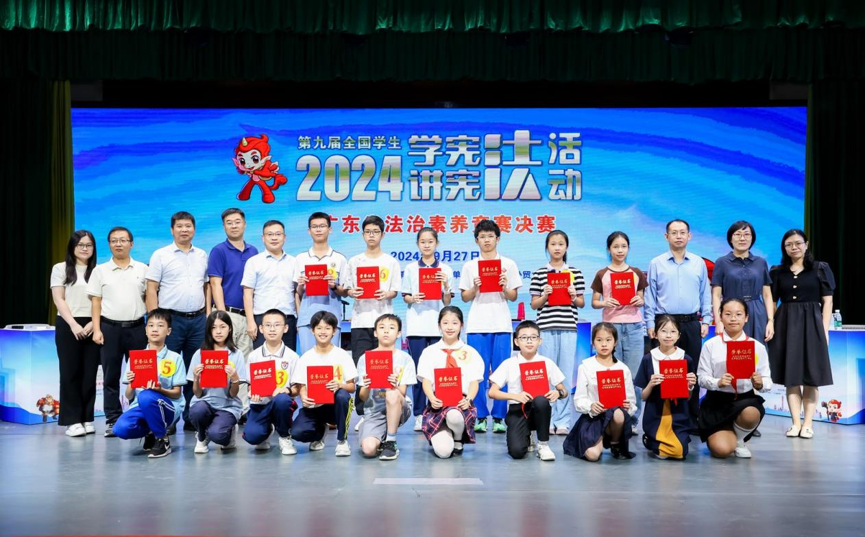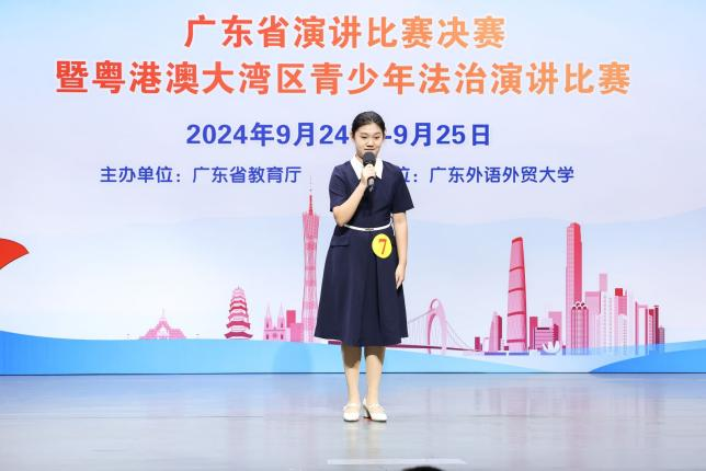 在9月24、25日第九届全国学生“学宪法 讲宪法”活动广东省演讲比赛决赛暨粤港澳大湾区青少年法治演讲比赛上,汕头市龙湖区金涛小学的余杭昕和广州市番禺区罗家桥虹小学的肖诺菲荣获小学组一等奖,广州外国语学校的柯浵琳、香港拔萃女書院的許詠詩和惠州市第一中学下埔校区的葛珈伊荣获初中组一等奖。广州市第五中学的宋一若和华南师范大学附属中学的高雅荣获高中组一等奖,华南师范大学的江博晨和中山大学的刘子愉荣获高校组一等奖。