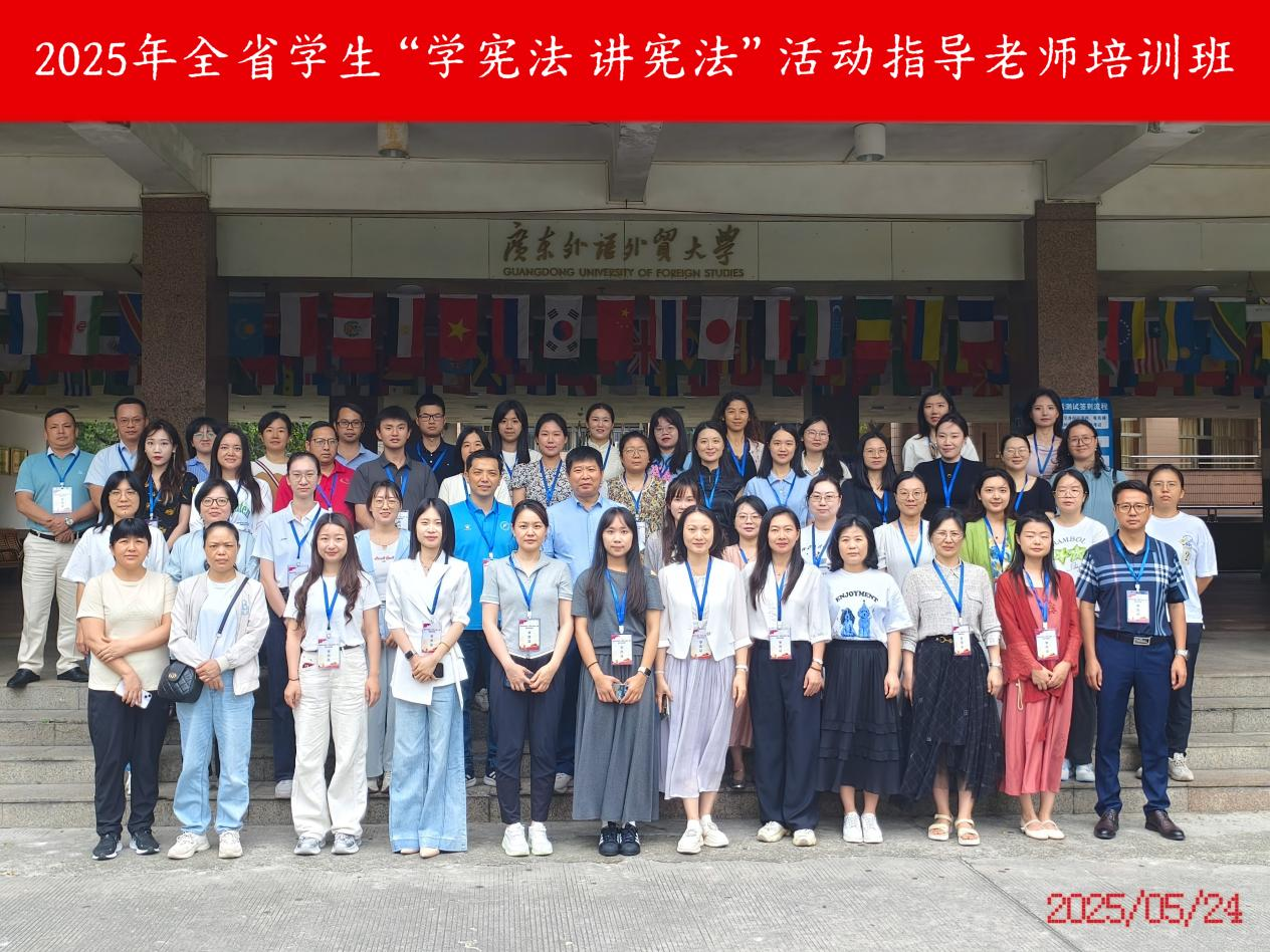 5月16日、17日和5月23日、24日,2025 年全省学生“学宪法 讲宪法”活动指导教师培训活动在广东外语外贸大学白云山校区举办。此次培训邀请青少年法治教育中心主任、广东外语外贸大学法学院潘高峰教授、广东外语外贸大学新闻与传播学院李洋教授、韶关学院政法学院副院长陈军教授担任主讲嘉宾。