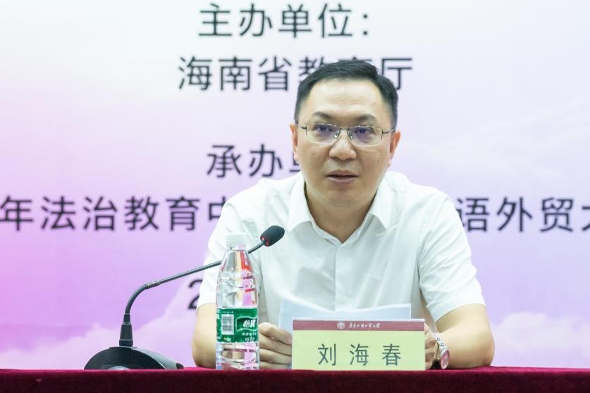 校党委常委、副校长刘海春在开班式致辞中代表我校对培训班顺利开班表示祝贺,对参训学员到来表示热烈欢迎,对海南省教育厅对广东外语外贸大学的信任和工作支持表示感谢。他对我校基本情况和青少年法治教育中心工作情况进行了简单介绍,强调要积极发挥广东外语外贸大学国际化特色、外语和法学优势,加强与海南合作,为推进海南校园法治建设和法治教育活动开展,培养更多海南优秀学子,打好基础。
